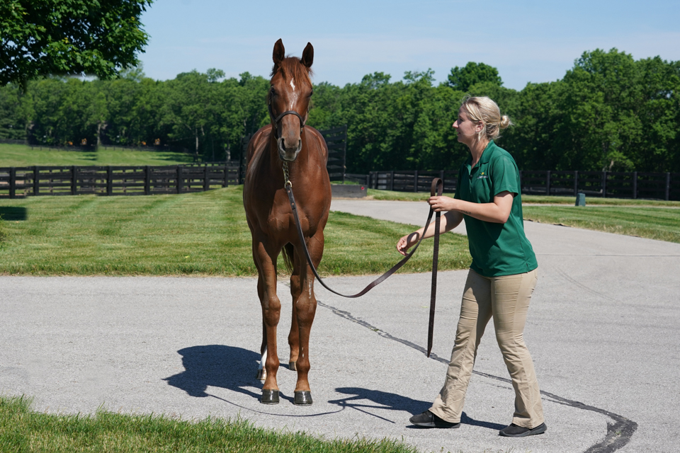 Stalled for surgery - a good sized filly with a pretty, balanced profile. Deep shoulder and heart girth, a little short coupled but has a nice hip and hind leg. Strong gaskin and forearm. Small feet. Both front rotate out. Upright and physitic through knees.