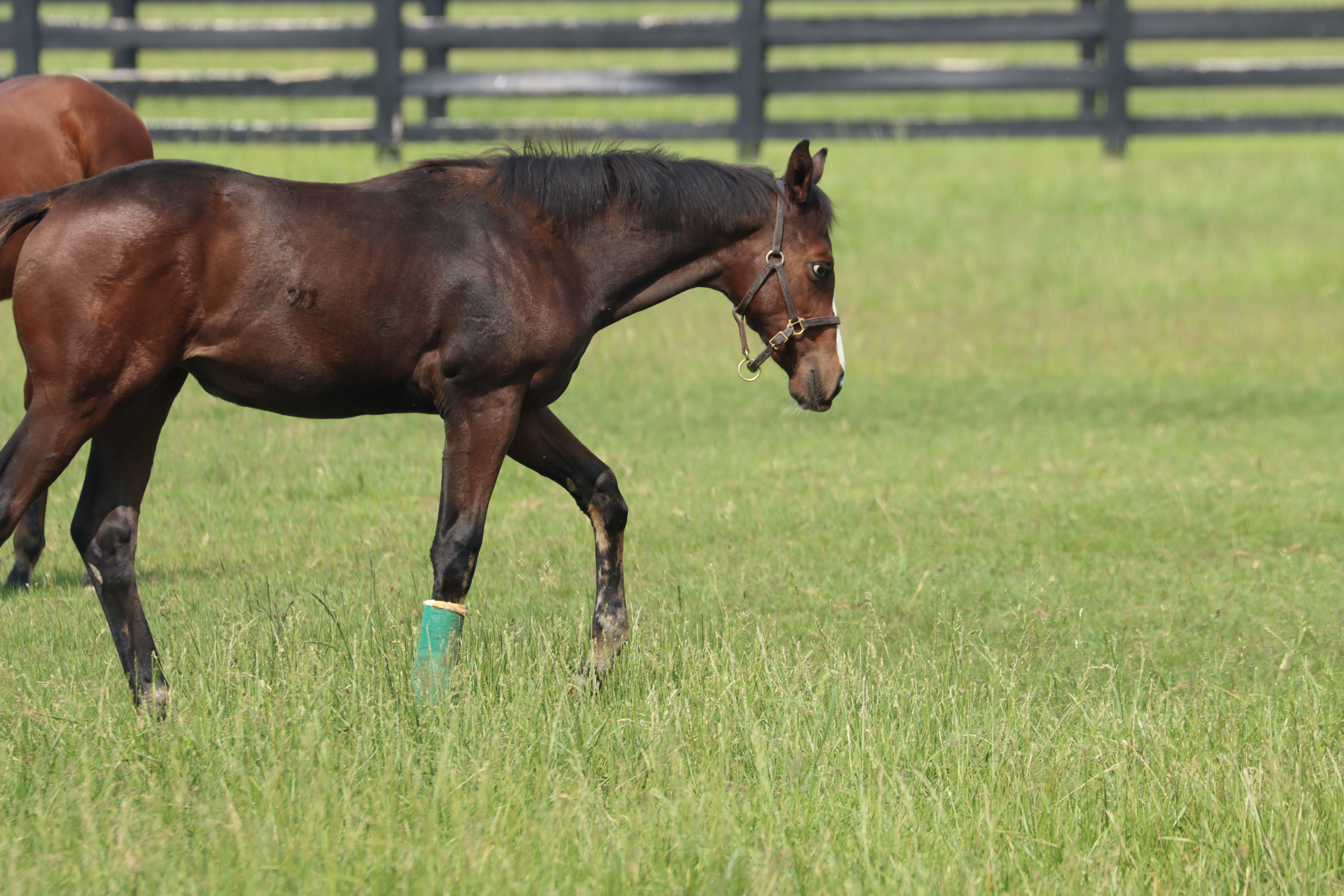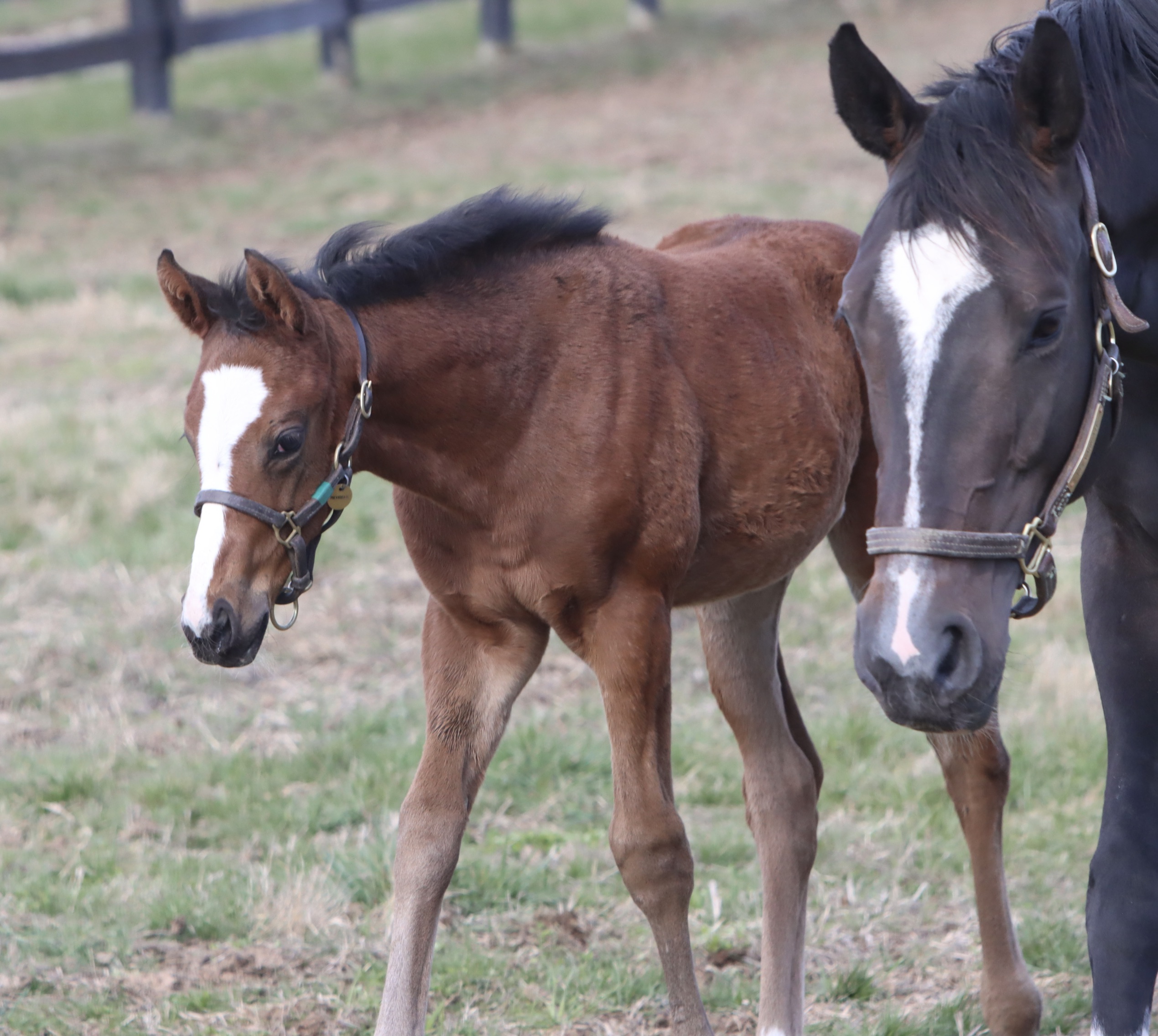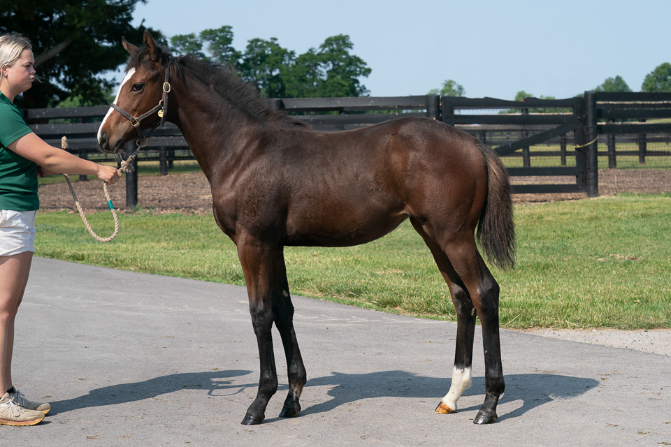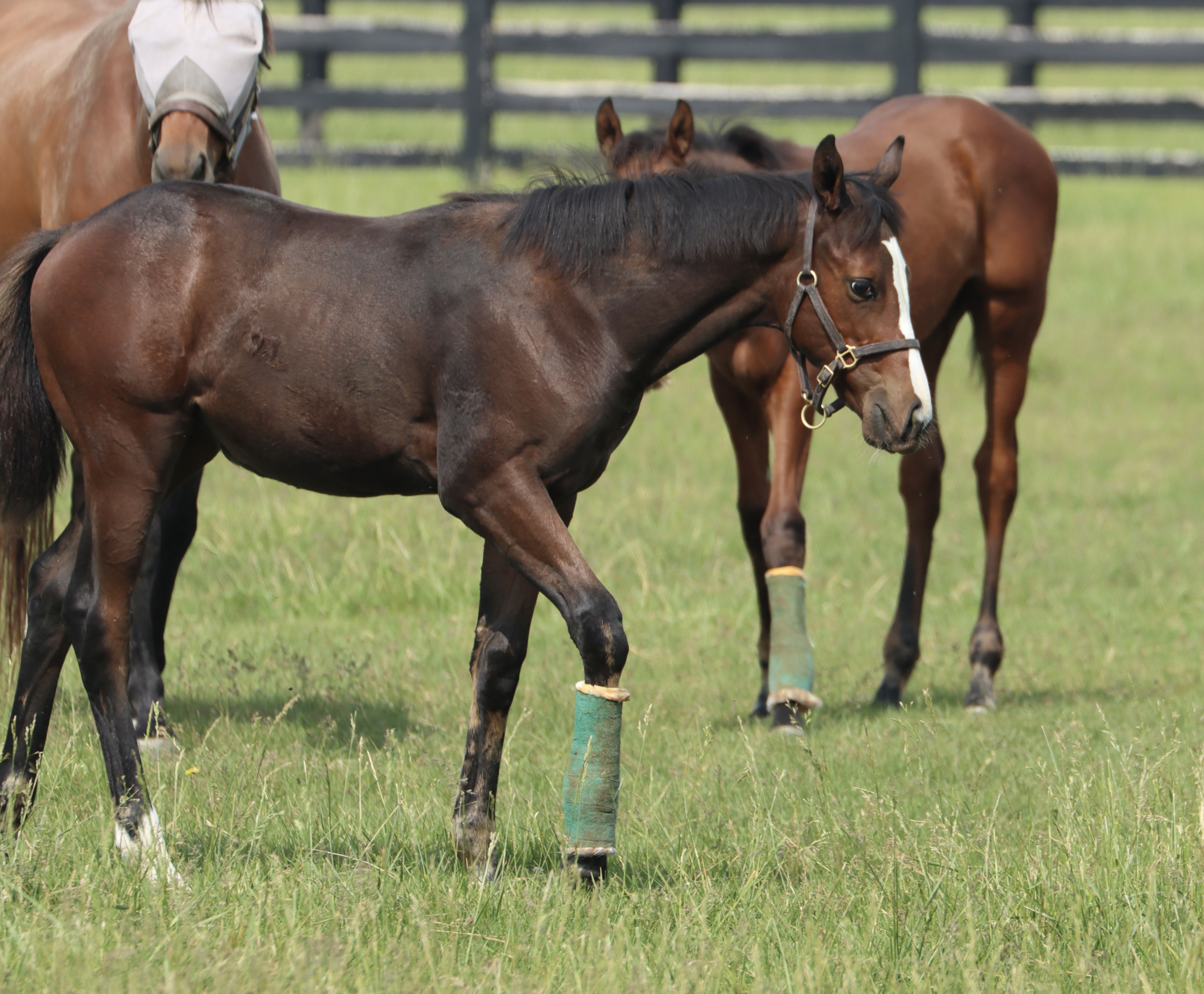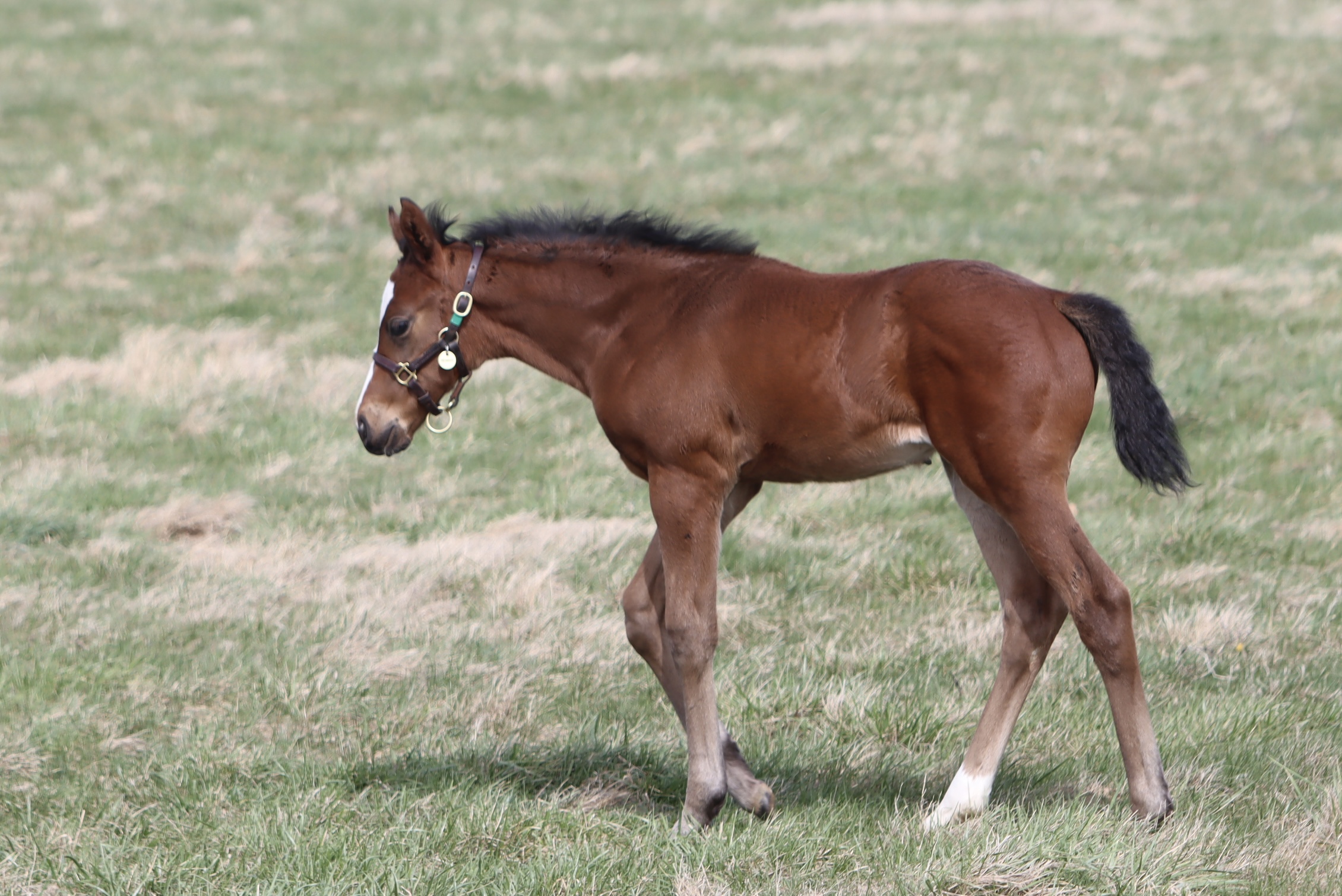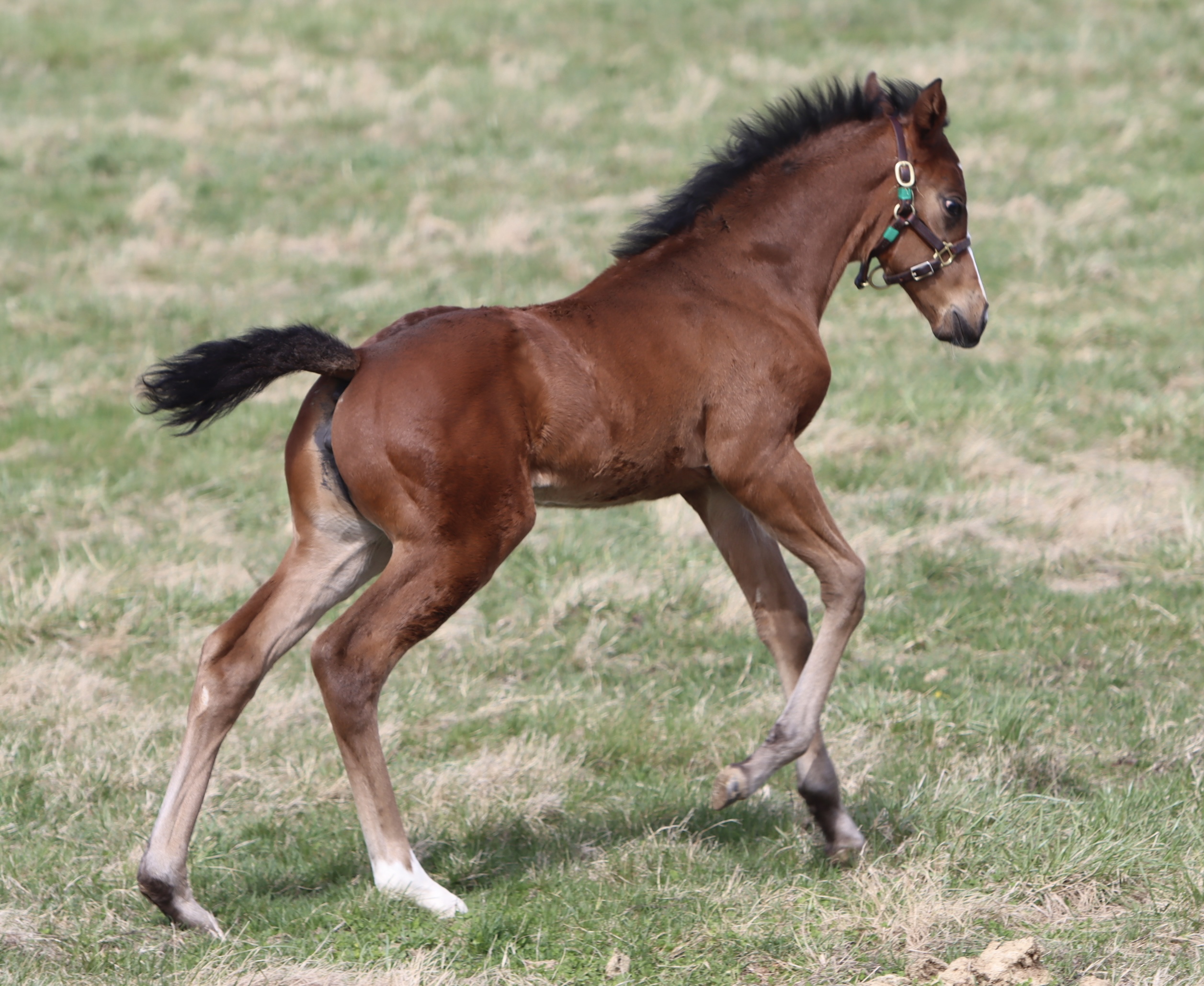 Medium size and is short coupled and has some balance. High behind. Typey and racy looking. Pretty head. First foal. Very slight out both fronts (had screws). Should improve as she matures.