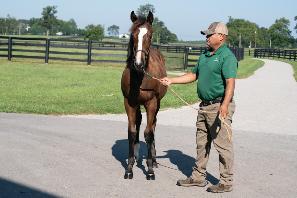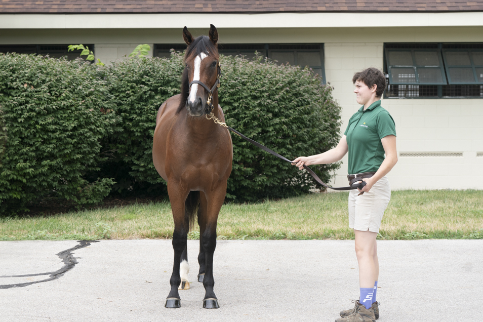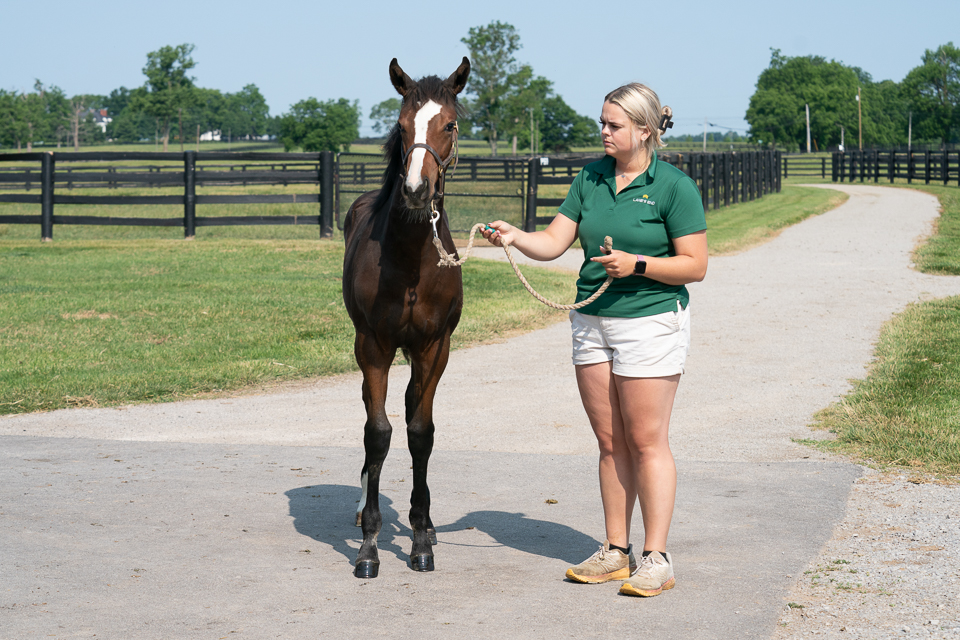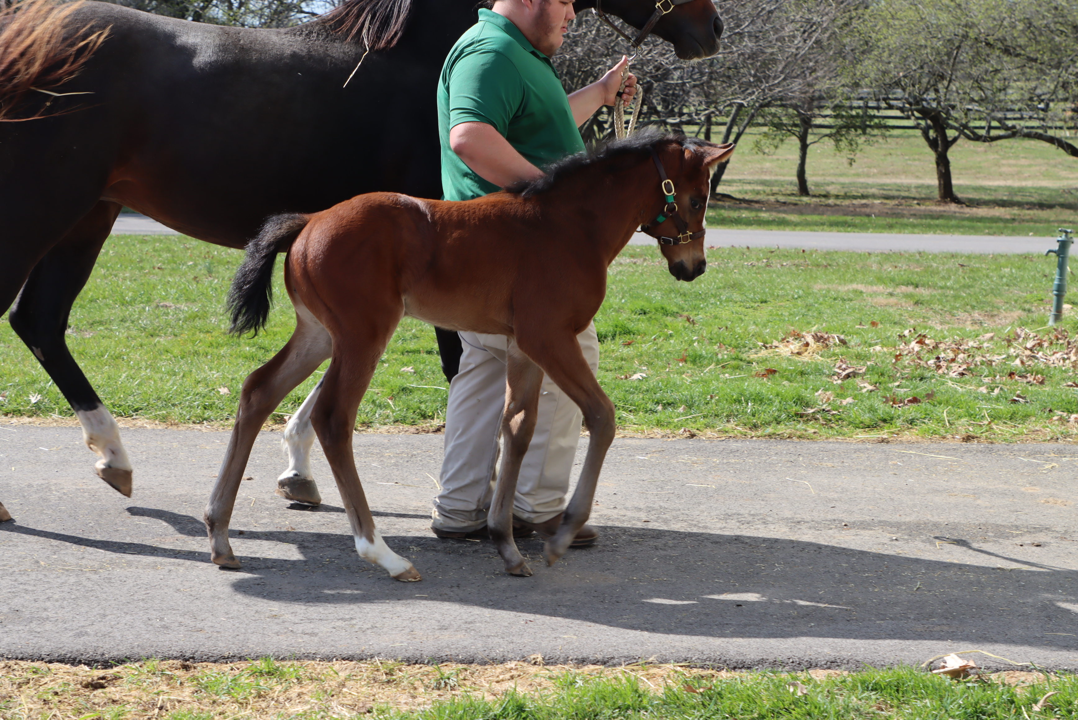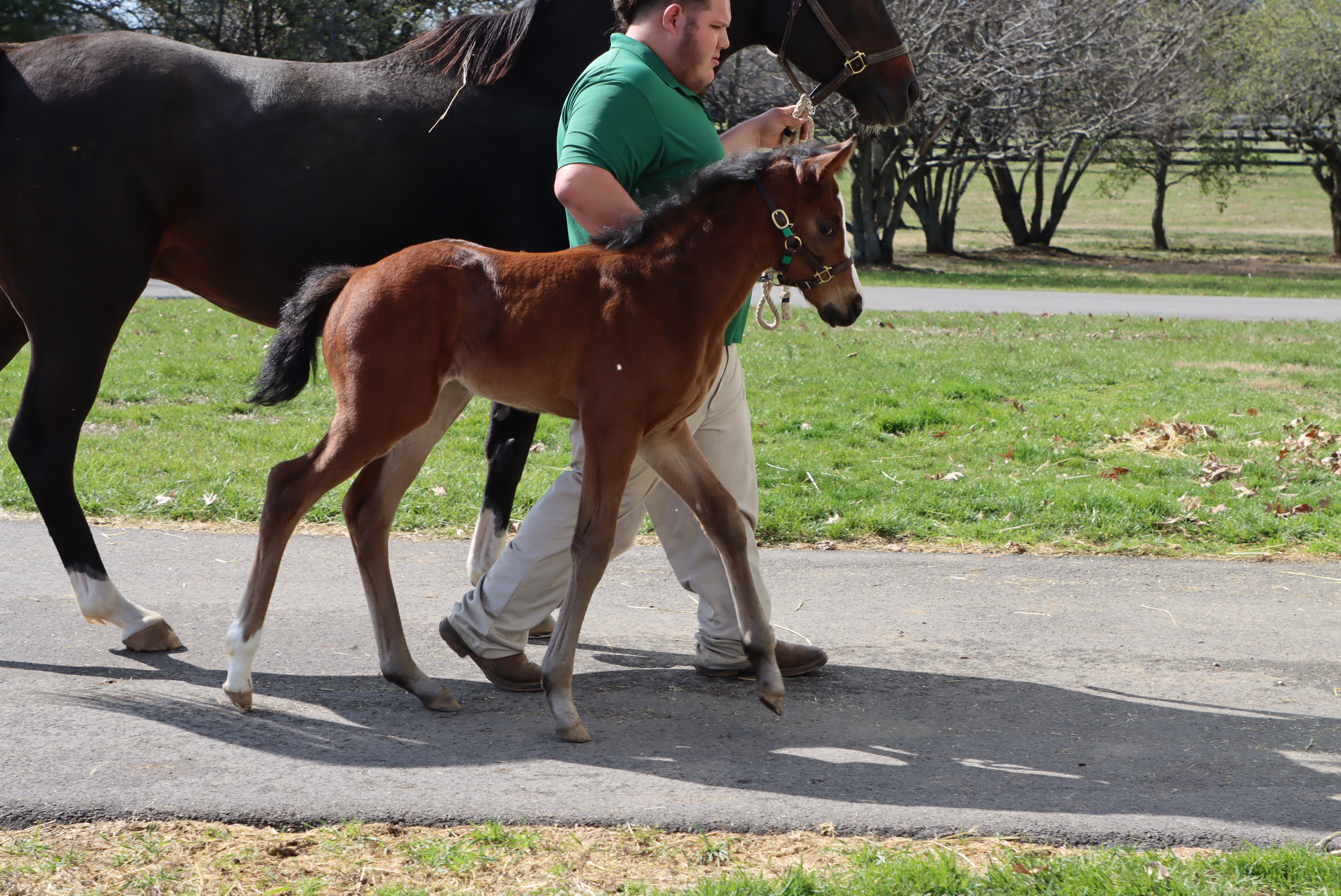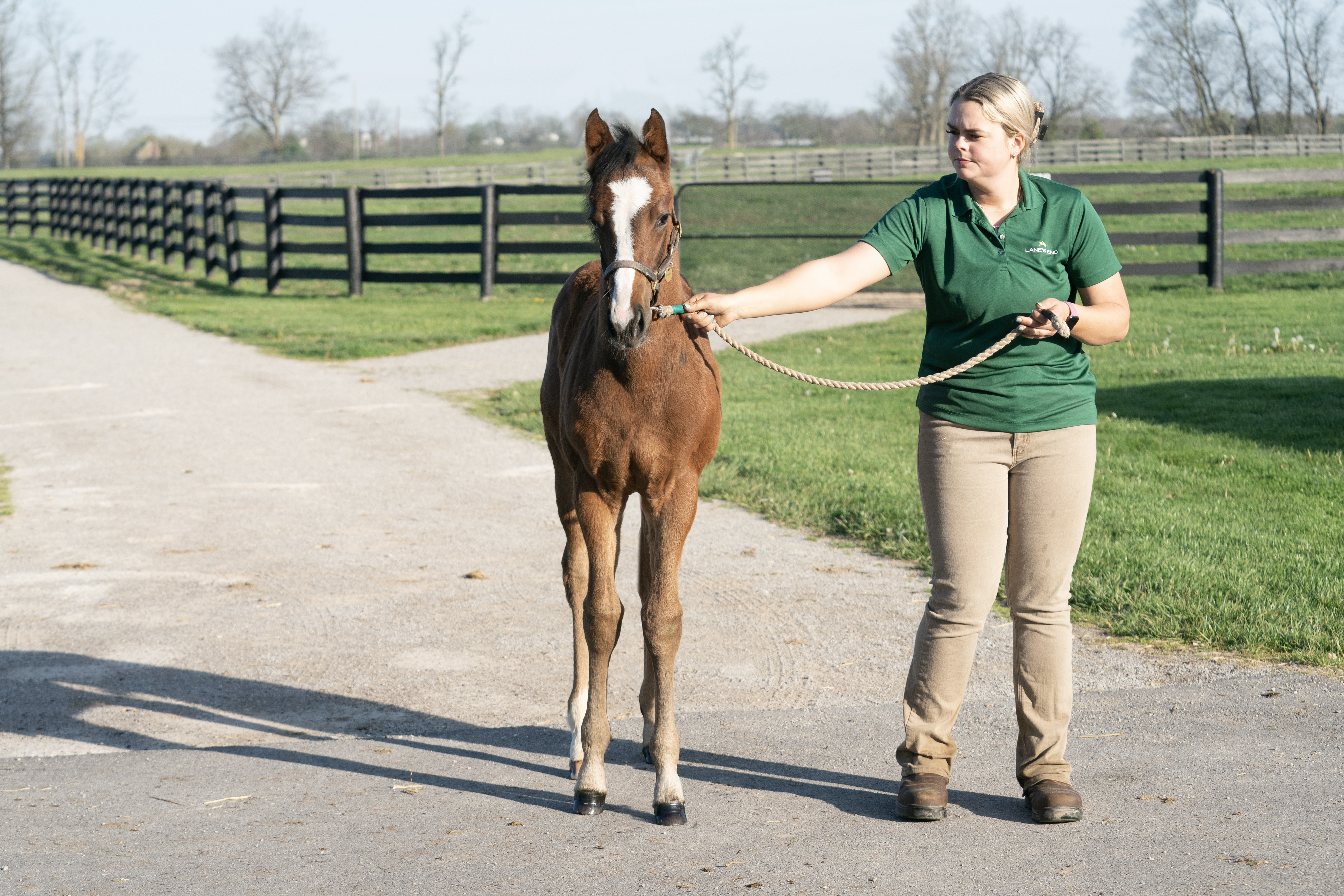 Medium size and is short coupled and has some balance. High behind. Typey and racy looking. Pretty head. First foal. Very slight out both fronts (had screws). Should improve as she matures.