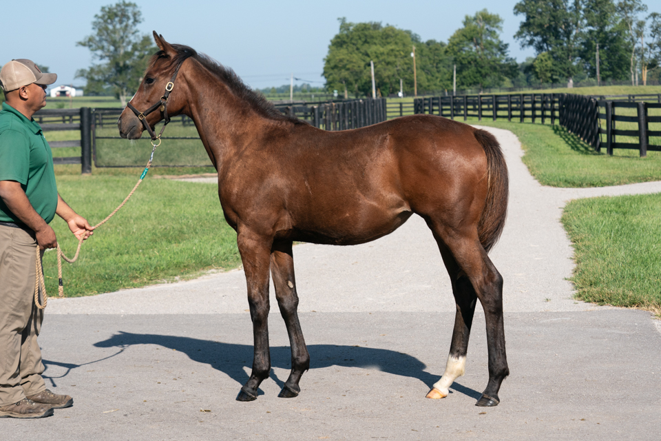 Medium size filly with good balance and and attractive outlook. Screws in both fronts for toe in, improving. A little less upright. Racy looking and should finish out well.