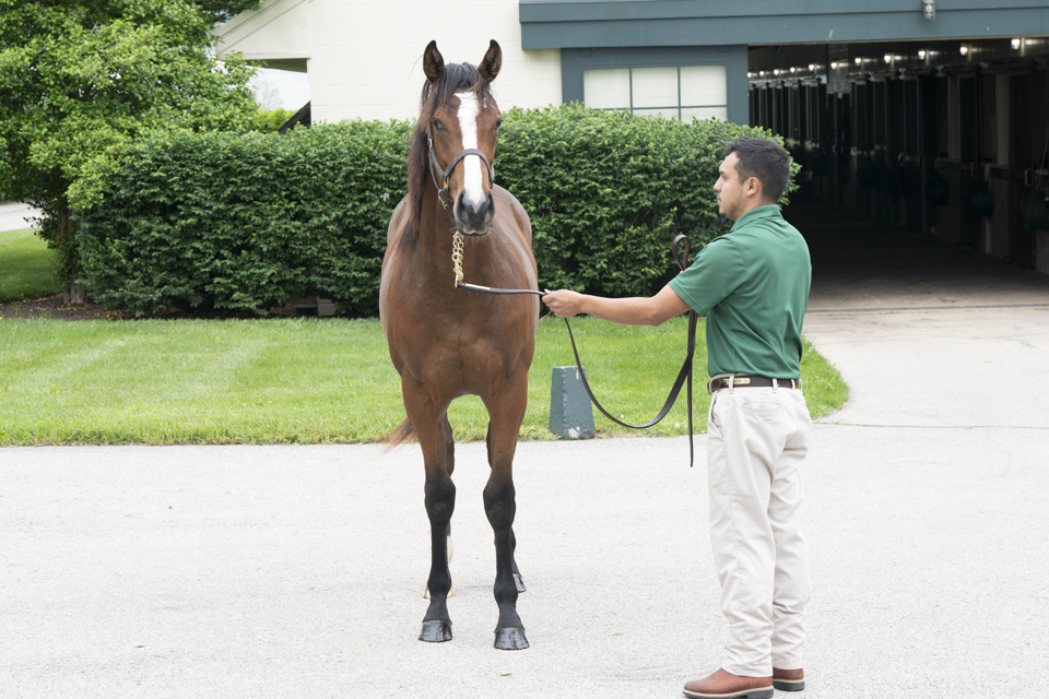 Toes in both front fetlocks and is under both hind fetlocks. Upright. Enough size. Well balanced. Good profile. Racy looking. Screws scheduled.