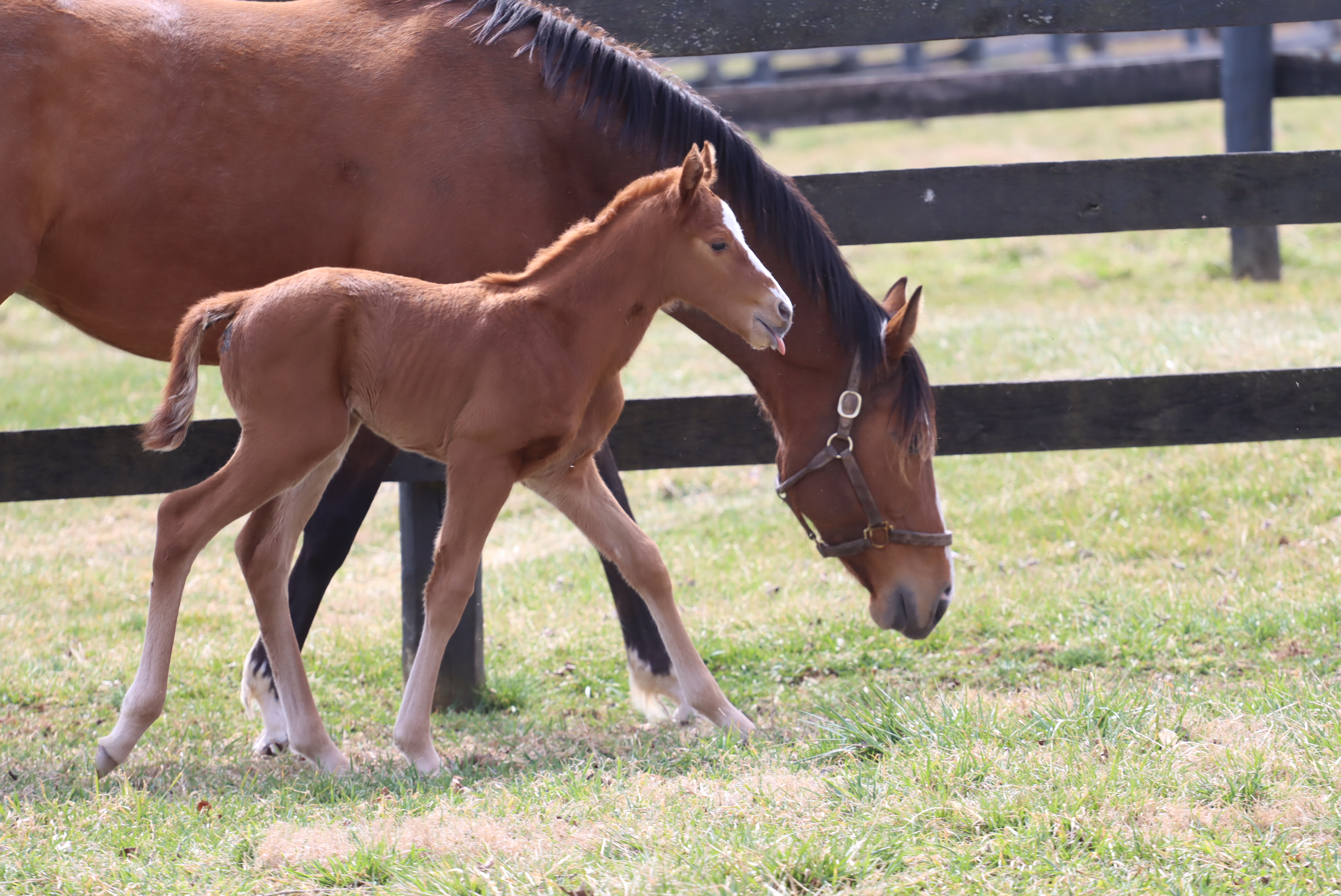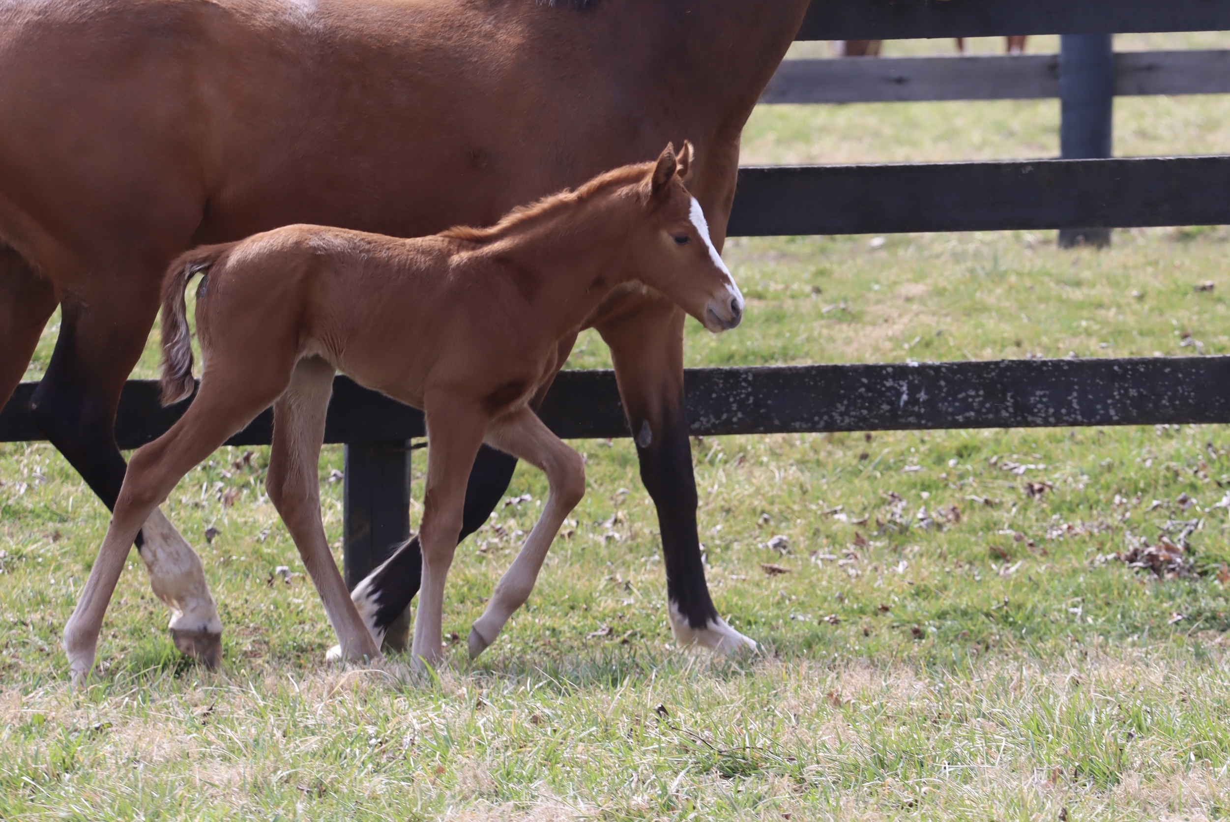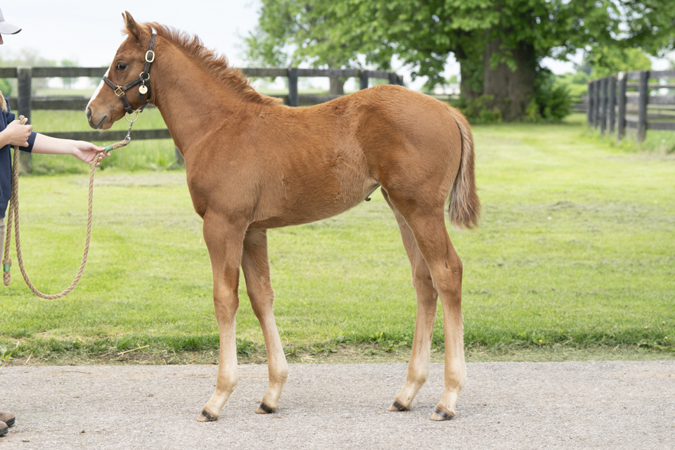 A small first foal that is lightly made. She does have a good shape to her frame and looks racy. Tracks ok and has a pretty head. Needs to grow.