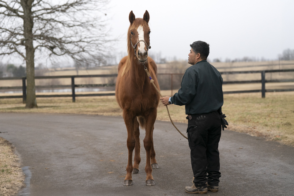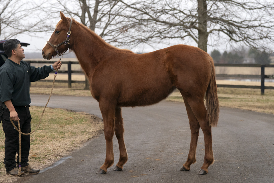 A smallish filly with average to light bone. She has a nice shape to her frame and profile. Hi behind and tracks ok. An elegant filly that has filled out a bit but needs to grow.